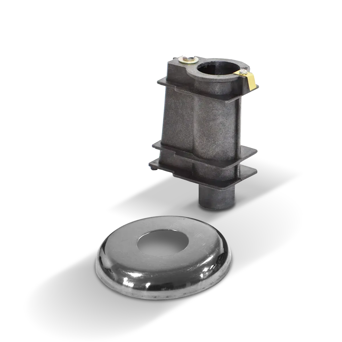 Anclaje Vulcano para ducha. Fabriacado de polipropileno con fibra de vidrio. Dispone de un borne con conexión a tierra; su sistema permite la correcta sujeción al piso con excelente terminación debido a que incluye un aro vista de acero inoxidable con terminación pulida brillante.