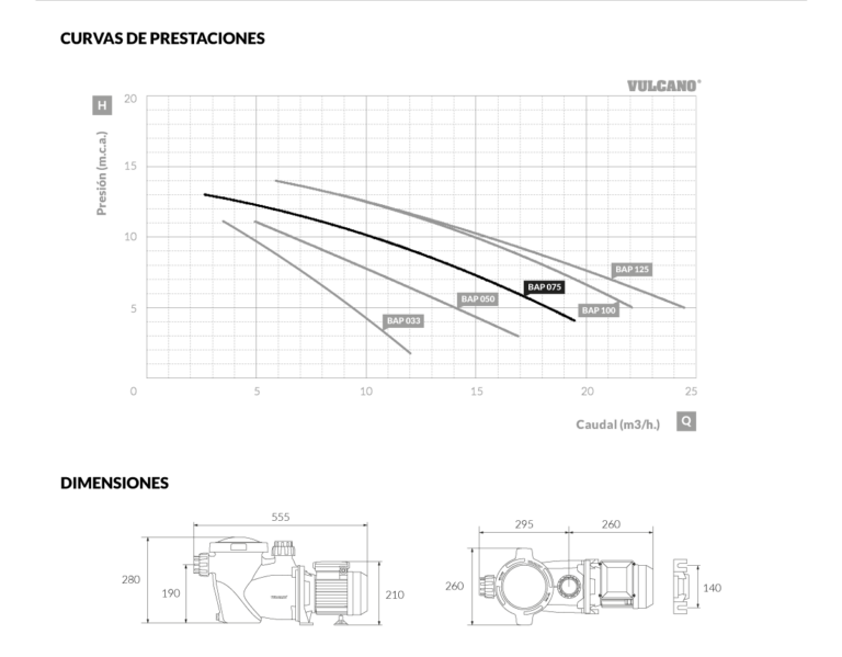 Bomba autocebante para piscina BAP 075 Vulcano. Ofrece un óptimo rendimiento para responder a las exigencias del uso profesional. Es utilizada para la recirculación de caudales de agua principalmente en piscinas medianas.