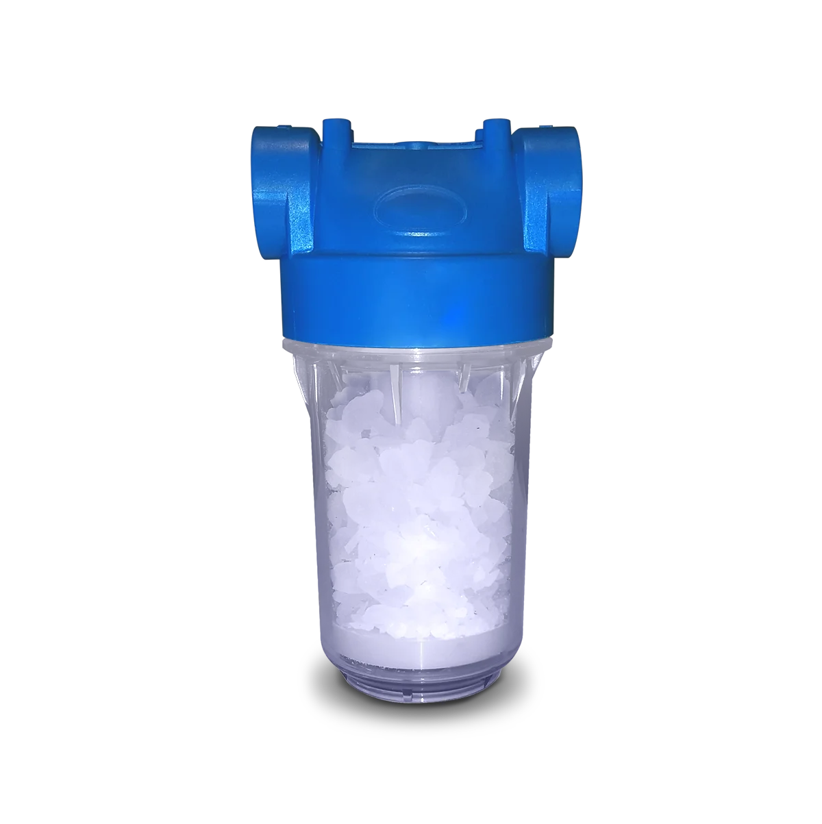 Filtro Ecosoft 3/4". Fabricado con cristales de polifosfato para la protección de electrodomésticos. Cabezal con polipropileno reforzado, vaso en SAN transparente y roscas 3/4” con insertos de latón. Incluye carga inicial de cristales de polifosfato.
