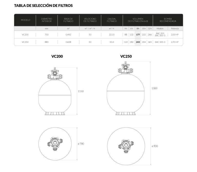 Filtro soplado VC-200 Vulcano de ø780 mm para piscinas de hasta 180 m³. Posee multiválvula selectora de 6 vías para las funciones de filtrado, retrolavado, desagote, enjuague, centrifugado y cierre. Fabricado en una sola pieza con materiales de alta resistencia a la corrosión, este equipo, garantiza larga vida útil con óptimo funcionamiento.