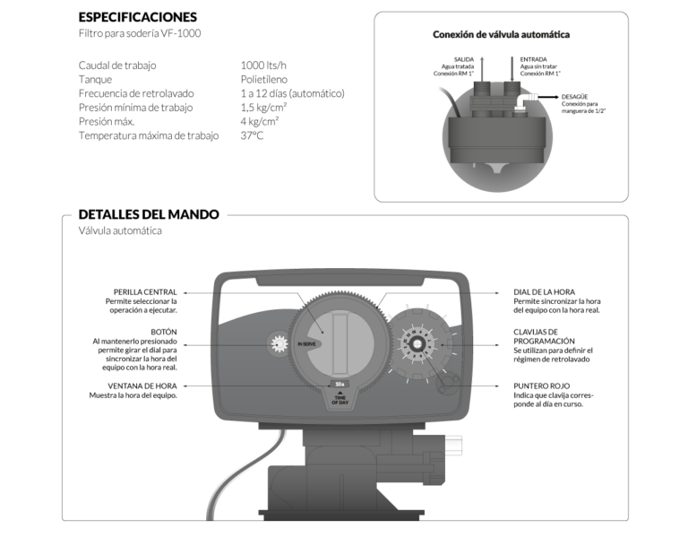 Cuenta con función de retrolavado automático y válvula cronométrica de 12 días. El equipo puede utilizarse con carga filtrante multimedia, para eliminación de sedimentos o con carbón activado, para eliminar los problemas de mal olor y sabor relacionados con la presencia de cloro residual presente en el suministro de agua potable de red.