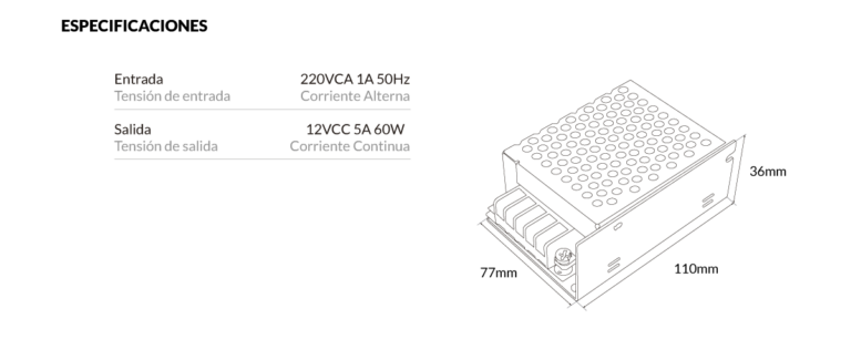Fuente Switching Vulcano 12V 5A (60W) para alimentar luminarias LED. Permite transformar la energía eléctrica que alimenta al sistema, reduciendo la tensión y rectificando el voltaje de corriente alterna (VCA) a corriente continua (VCC).