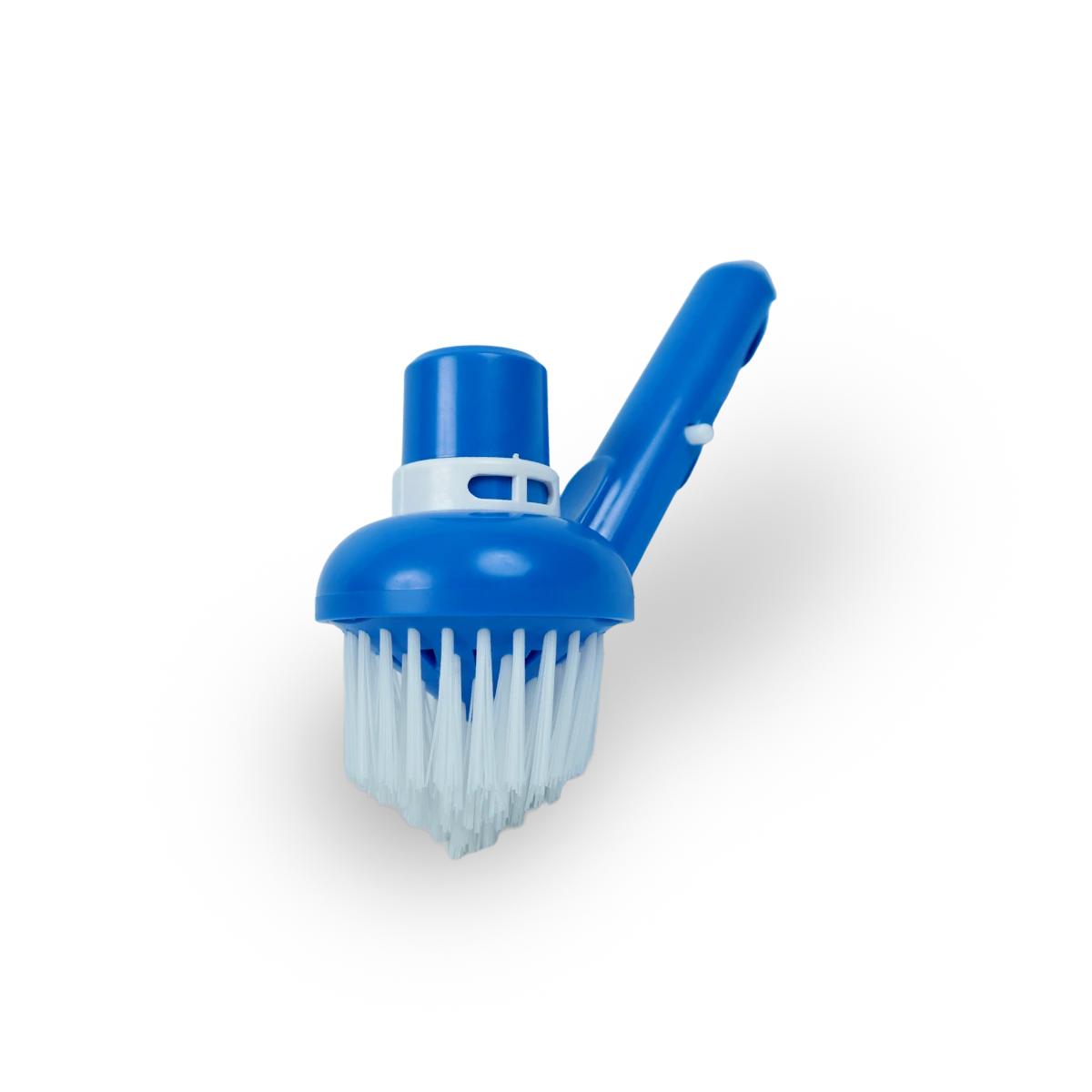 Limpiafondo esquina c/cepillo y regulador. Dispositivo para aspirar suciedad y residuos depositados en el fondo de la piscina. Para utilizarlo, se debe conectar la manguera flotante al acople de aspiración y un mango fijo o telescópico.