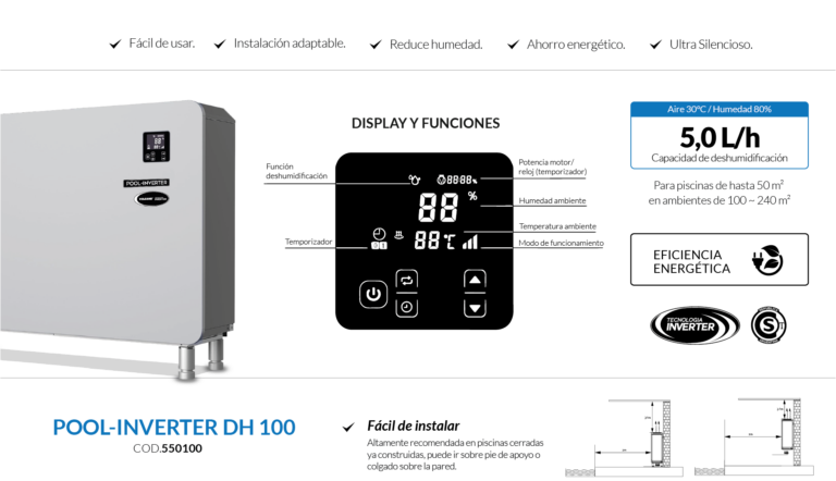 POOL-INVERTER DH 100 para reducir la humedad en natatorios y piscinas cerradas con una superficie de 50 m². Este equipo tiene la capacidad de reducir los excesos de humedad, manteniéndola en porcentajes ideales para un máximo confort del ambiente.