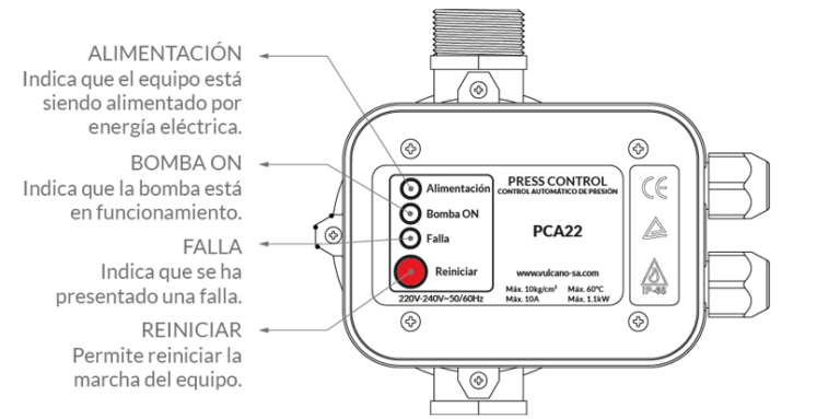 Press control Vulcano. Diseñado para controlar automáticamente el funcionamiento de la bomba, siendo la solución ideal para aumentar la presión de las tuberías en instalaciones. Su función principal es mantener el sistema doméstico de suministro de agua en el estado de funcionamiento a presión constante.